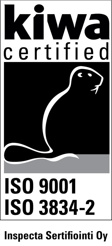 Ohutlevytuotantomme laatujärjestelmä on rakennettu ISO 9001:2015 ja hitsauksen ISO 3834-2 -laatustandardien mukaisesti. Se kattaa suunnittelun, myynnin, markkinoinnin ja valmistuksen kaikissa toimipisteissämme.